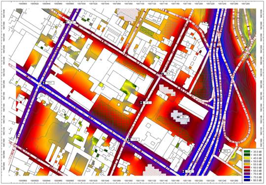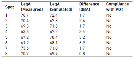 As can be seen in Table 1, differences between measurements and simulation are maximum 2.6 dB in spots were traffic noise is the main noise source, which means that the noise prediction method used for the simulation, in this case NMBP Routes 96, get to model the behavior of noise in the area of study. On the other hand, spots 4, 5 and 6 present the major differences when compared with simulation. This can be explained because of the noise source in those spots are voices. Additionally, results show that noise levels measured does not comply with vales established by the statute 627 (65 dBA) for sector B. Consequently, it is necessary to implement actions plants in favor of reducing noise levels. As actions plans can be considered traffic management strategic which considered reduce the number of heavy vehicles than transit on the streets.