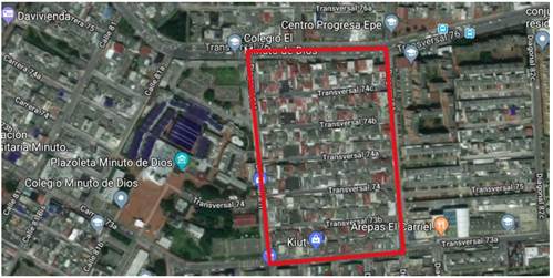 In 2018, the first phase of the project began at the Minuto de Dios University thanks to the Technologies and Innovation Solutions group, assigned to the Systems Engineering Faculty, under the direction of the cooperative VISIBILITY research group with the IT-UNIMINUTO research group. Figure 8 shows the map of the study area where students make their field trip with the counting, measurement and assessment of the grids surrounding the boundaries of the institution.