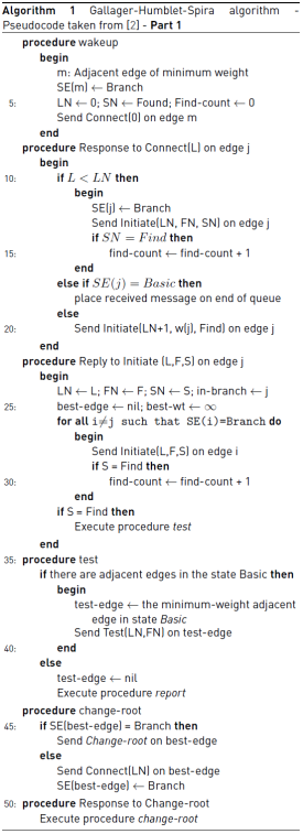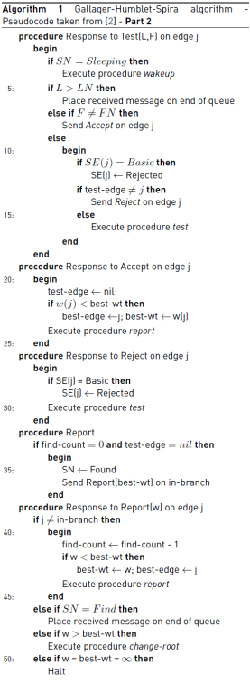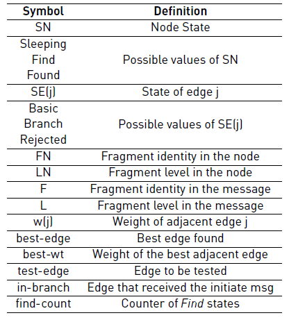 Before explaining the details of the GHS algorithm, it is necessary to define the states of the nodes and the edges. A node has two states: find or found. In the find-state, the node is examining its edges to find the one which is outgoing and has the lowest weight. Besides, the node is waiting that its children report their lowest-weight outgoing edge. In the found-state, the node has sent to its parent the information about its lowest-weight outgoing edge. Additionally, the node waits for a request to join its fragment with the adjacent one via its lowest-weight outgoing edge; or, it waits for a message informing that the union was completed by another node within its fragment. An edge has three states: basic, branch, and rejected. A basic edge does not specify whether it belongs to the minimum spanning tree or not; a branch edge belongs to the minimum spanning tree; and, a rejected edge does not belong.