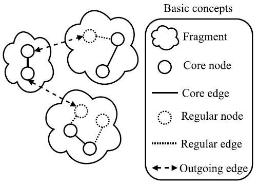 Next, we describe the basic concepts of GHS (See Figure 1]. A fragment is a connected subgraph that belongs to the minimum spanning tree. Fragments can only join via a particular kind of edge, known as the outgoing edge. As a general rule, an outgoing edge has a node that belongs to the fragment and another node that does not. Since a fragment could have more than one outgoing edge, the lowest-weight outgoing edge of a fragment is an outgoing edge whose weight is the lowest. [2] proves that the lowest-weight outgoing edge of a fragment always belongs to the minimum spanning tree. Additionally, the core nodes are the central computing units of the fragment. They find the lowest-weight outgoing edge of a fragment by collecting information about all the outgoing edges. Besides, they initiate the union of two fragments. Finally, the core edge is the one that connects two core nodes.
