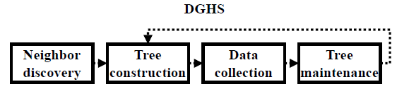 The Dynamic Gallager-Humblet-Spira (DGHS) algorithm builds and maintains a minimum spanning tree. To do so, DGHS is divided into four phases, namely neighbor discovery, tree construction, data collection, and tree maintenance (See Figure 2]. In the neighbor discovery phase, the nodes collect information about their neighbors and the link quality. DGHS defines the link quality as the average number of lost discovery packets. In the tree construction, DGHS finds the minimum spanning tree by executing GHS. In GHS, each node is a different fragment. Subsequently, pairs of fragments merge into a new one. The fragments continue to join until only one remains: the final fragment is the minimum spanning tree. However, this minimum spanning tree is not rooted at the sink. Hence, in the data collection phase, the sink roots the minimum spanning tree at itself by sending a single control message via the branches of the tree. Then, each node starts sending data packets. In the tree maintenance phase, the nodes repair the tree when communication failures occur by merging disconnected fragments. The repair mechanism is initiated by the sink and partially reruns GHS to join disconnected fragments.