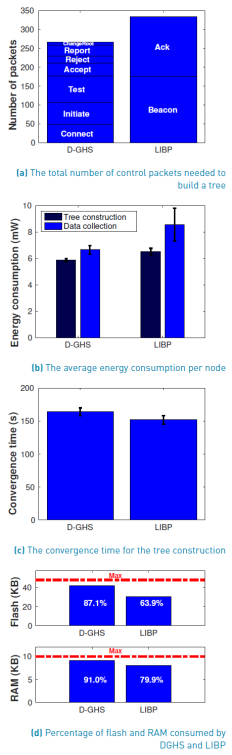 Figure 3d shows the percentage of flash and RAM consumed by DGHS and LIBP on the TelosB nodes. We see that DGHS slightly consumes more memory than LIBP: it consumes 23.2% more flash and 11.1% more RAM. The higher memory consumption of DGHS is because it requires seven types of control messages and LIBP only requires two. The additional control messages of DGHS employ additional structures, lists, and validations causing a higher memory consumption. This result was expected since DGHS can find the minimum spanning tree, so, it is more complex than a protocol that finds a sub-optimal tree such as LIBP. It is important to mention that the flash and RAM usage of DGHS is near to the maximum. DGHS consumes 41.8KB out of 48KB of flash (i.e., 87.1%), and 9.1KB out of 10KB of RAM (i.e., 91.0%). So, DGHS implementation has little space to add new functionalities. A straightforward solution to this problem is to use a node with more memory resources. For example, the RE-Mote (manufacturer Zolertia) has 512KB of flash and 32KB of RAM; the wismote (manufacturer arago-systems) has 256KB of flash and 16KB of RAM. In this way, implementing DGHS in those nodes would leave room for plenty of new functionalities such as adding IPv6.