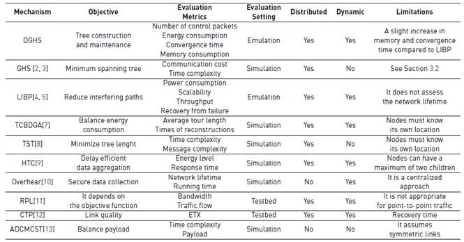 The problem of constructing and maintaining a tree topology in a distributed manner is a challenging task. This is because the nodes have limited computational and memory resources and the network is dynamic: the nodes are prone to failures, and the channel quality varies over time [1]. We present relevant work that aims at solving this problem and summarize our findings in Table 1. Note that this table also serves as a qualitative comparison of DGHS with previous work.