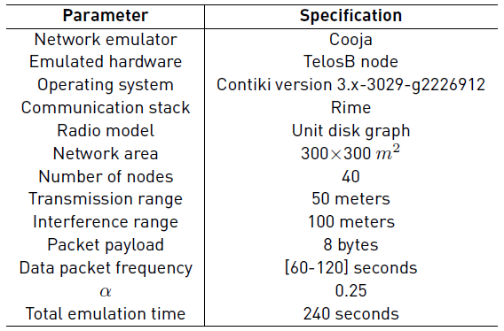 We emulate 40 TelosB nodes in a 300 X 300 m2 area. The nodes are randomly scattered. Regarding the wireless channel, we use the unit disk graph model which assumes that the nodes communicate and interfere in fixed-radius circles. Besides, the transmission range is 50 meters, and the interference range is 100 meters. During the data collection, each node sends a data packet every X seconds, where X is a random number between [60,120] seconds; the packet payload is 8 bytes. We run 20 emulations with different seeds and average the results. Table 3 shows the configuration parameters for the emulations.