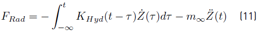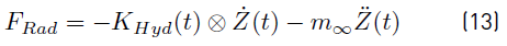 physically represents an additional weight of the buoy due to the water surrounding it. Meanwhile, the hydrodynamic damping (KHyd ) physically represents a damping effect, which is a product of the water viscosity acting over the body oscillation stopping it. Equation (11) corresponds to the equation that represents FRad .