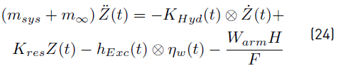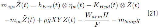 Now, when Equation (14), (17) and (20) are replaced in Equation (6), the equation of the buoy motion can be rewritten as Equation (21).