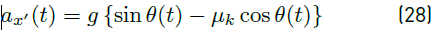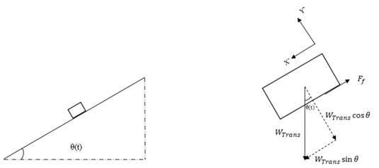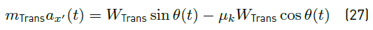 In Equation (27), µk is the dynamic friction coefficient whose value is given in Table 1. As WTrans is equal to mTrans g, simplifying this expression, ax' is represented by Equation (28) .