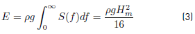 The total stored energy (E) in a wave per unit area of the sea surface is the sum of the kinetic and potential energy. The potential energy of the wave is due to the elevation of water from the waves trough up to the crest. E can be expressed in terms of Hm and S(f) according to Equation (3) [25].