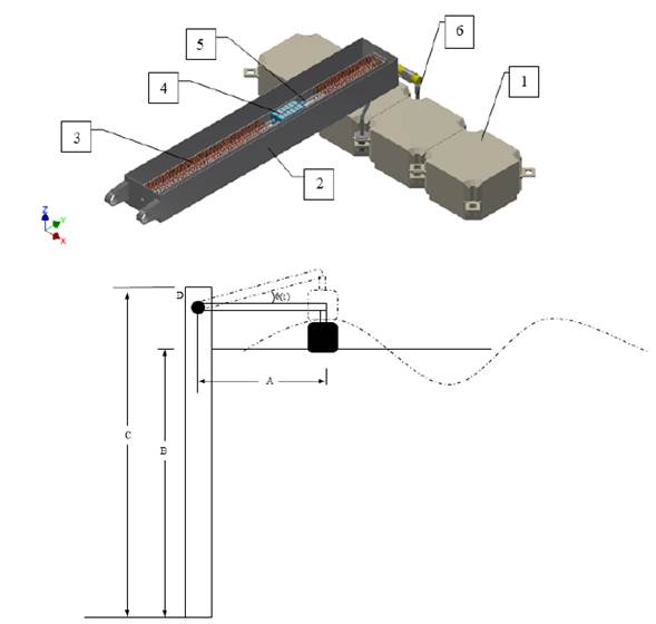 In Figure 1, the conceptual design of the device can be seen. When an incoming wave reaches the buoy, it is displaced throughout the z-axis direction a distance equal to the wave amplitude. The arm is pivoted at D point; so that the vertical movement caused by the incoming wave produces a rotational movement of the arm. This rotation generates an angle (θ (t)) measured between the calm water level and the arm position; this angle is a function of time and the incoming wave amplitude; it is directly the responsible to generate the electric power.