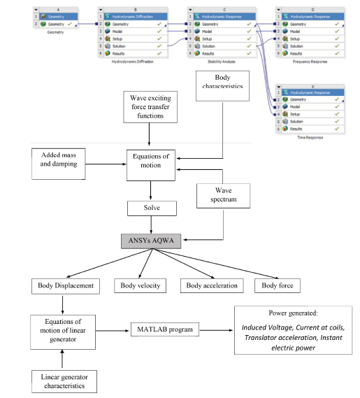 To know the behavior of the WEC in Ansys Aqwa®, executing a Hydrodynamic Diffraction analysis is required first with the final purpose to determine the variation of the effects on the buoy with the frequency. To carry out this simulation, mass properties of the bodies should be configured at the center of gravity of each body. The connection between the support and the arm was configured as a kinematic pair of revolute, in order to the arm rotates around the connection point, as it was exposed in the operation of the system. Lastly, the arm was defined as a body free to move, and the support was fixed in a place. In this study, the frequency domain was setup to embrace the interval of frequencies proper of the Pacific Ocean. Likewise, the direction of the waves was configured to be 90° perpendicular to the buoy. The computational procedure employed in this work can be outline as observed in the flow chart of Figure 5.