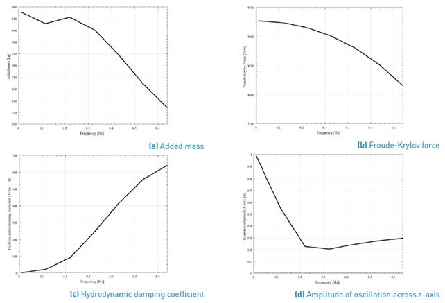 Figure 6 shows the results of this simulation. Figure 6a) corresponds to the variation of the added mass with the frequencies. As observed, the value of the added mass decays with the increase of the frequency. The added mass physically represents an additional force that opposes the movement. A desired result is that the value of this mass is as small as possible. From Figure 6a), it can be concluded that higher values of frequency will lead to a better performance of the device.