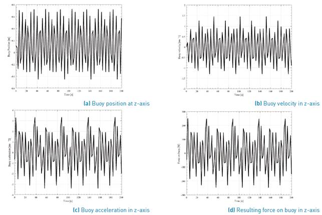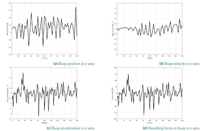 The velocity, acceleration and net force over the buoy reach higher peak values when a regular wave interacts with the buoy. Consequently, under a regular wave, the system presents more regularity in functioning. This is adequate for electric power generation because it is easier to configure the electronic control system used to make the energy exploitable.