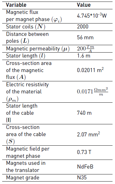 To harvest the wave energy and convert it into electric energy, transforming the wave movement in a relative movement between the coils and the permanent magnets is required. For this purpose, several systems have been developed. Generally, these systems have a mechanism that transforms the buoy displacement into rotational movement. In this regard, recently, the development of systems that take advantage of the buoy movement without requiring an intermediate mechanism has taken force in the electric power generation from waves. These devices are known as linear generators. As the conventional rotatory generators, these machines work under the Faraday´s Induction law. When the translator moves, a magnetic domain change with time is observed, which produces an induced current in a loop of conductive material, according to the mentioned law. In the dynamic model shown in Equation (24), the mass of the translator was considered as negligible for this analysis in comparison with the mass of the rigid arm.