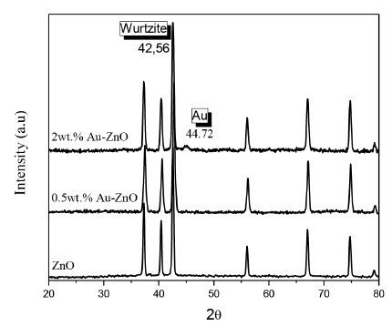 Figure 1 shows the XRD patterns for the Zinc Oxide modified photocatalysts, by this technique it was possible to identify the diffraction peaks (100), (002), (101), (102), (110), (103), (200), (112) and (201) these peaks are located in the 2 θ positions of 37.26°, 40.40°, 42.56°, 56.04°, 67.05°, 74.78° and 79.17°, respectively [17]. These peaks correspond to the hexagonal Wurtzite, the crystalline form characteristic of ZnO. It was also possible to determine that the photodeposition of 0.5 wt.% Au on ZnO surface did not modify the XRD patterns; it can be mainly due to the low content and size of the gold nanoparticles in this material; however, in the photocatalyst prepared with the highest gold content (2 wt.% Au-ZnO), it is evident the presence of a diffraction peak characteristic of the metallic gold, located at 44.72º, as it is indicated in Figure 1.
