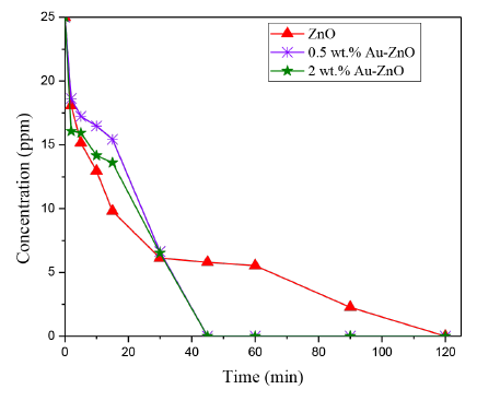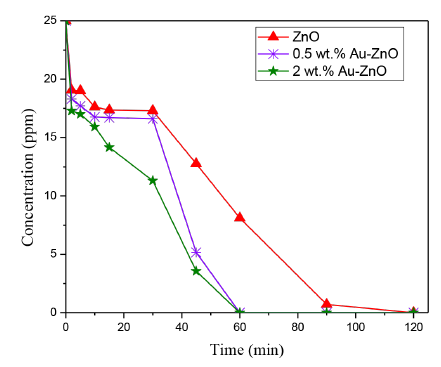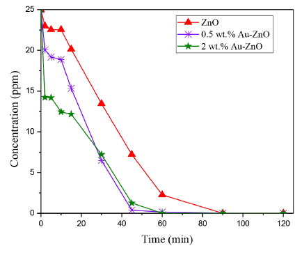 As it can be observed in Figure 8, the Phenol concentration significantly decreases under UV-Visible light and in presence of a photocatalyst compared with the results observed in the photolysis tests previously presented. It is also observed that the Au addition on ZnO surface, significantly improves the photocatalytic efficiency of this semiconductor in the Phenol photodegradation; thus, the total Phenol degradation was achieved in half the time with Au-ZnO compared with bare ZnO. In 60 minutes of photoreaction, no Phenol was detected in the liquid phase by using 0.5 or 2 wt.% Au-ZnO; however, the highest reaction rate in the phenol degradation was achieved by using the photocatalyst prepared with 2 wt.% of gold (i.e 6.9x10-3 mg of Phenol. L-1. s-1).