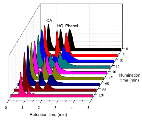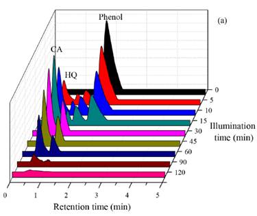 As it can be seen in Figure 11, after 10 minutes of illumination time, both, Phenol and hydroquinone start to be transformed in other compounds, which are evident due to the formation of two new signals in the chromatogram. In the case of the mix phenolic compounds photodegradation, it is observed that the effectiveness of the photocatalytic process is lower than the obtained in the tests performed with the phenolic substrates individually, thus, the total mineralization of these compounds was not achieved even after 120 min of photocatalytic treatment. This behavior is due to the simultaneous presence of three pollutants which can be transformed into others at the same time; in addition, these phenolic compounds can compete with each other by the hydroxyl radicals during the photocatalytic reaction, as it can be also explained by other authors [25]; this is one of the main challenge to deal when the photocatalytic processes are employed at big scale in the treatment of real wastewater polluted simultaneously with different organic and inorganic compounds.