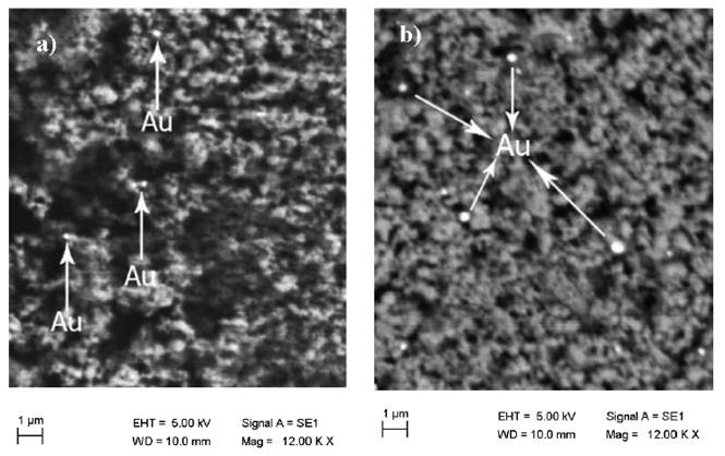 In order to observe the morphology and gold particles dispersion on ZnO surface, SEM analyzes were performed by using an EVO MA10 Zeiss microscope.