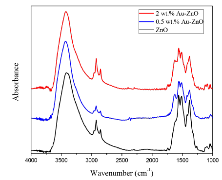 Figure 3 shows the FTIR spectra obtained for the photocatalysts analyzed, in the ZnO spectrum it is possible to identify a wide band located at 3,408 cm-1, which corresponds to hydroxyl groups; the bands observed in the region between 1,558 cm-1 and 1,386 cm-1 correspond to H-O-H flexion vibration signals, these bands indicate the presence of water linked to the ZnO structure [18, 19]. By FTIR, it was also observed that the intensity of the bands located between 2,500 and 3,000 cm-1 and between 1,000 and 2,000 cm-1 slightly decreases after gold photodeposition, it is most evident in the photocatalyst prepared with 0.5 wt.% of Au compared with the material prepared with 2 wt.%, it is mainly due to the higher number of Au nanoparticles present in the catalysts 0.5 wt.% Au-ZnO compared with their counterpart 2 wt.% Au-ZnO, thus, the gold nanoparticles can reduce the starting surface hydroxylation of ZnO, this effect is less evident when the gold content increases, it is because, the photocatalyst prepared with 2 wt.% of gold shows the highest particles size, as it can be observed by the SEM analyzes presented in the previous section [Figure 2].
