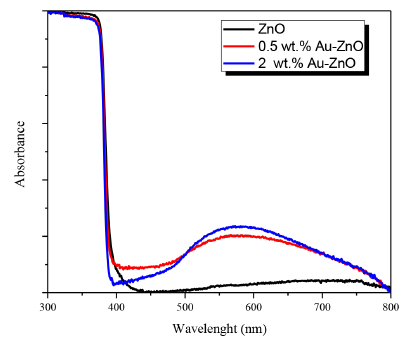 It is widely known that the noble metal doping of ZnO leads to improve the photocatalytic efficiency of this semiconductor [13, 24], this is because the noble metal nanoparticles act as a sink for the electrons generated during the photocatalytic reaction, thus avoiding the electron - hole recombination, and therefore increasing the half life time of the photogenerated charges. In addition, the gold nanoparticles addition modifies the ZnO color; starting ZnO present a white color and after gold addition a purple color is observed, this color change leads to increase the absorption of this oxide in the visible region of the electromagnetic spectrum as it was observed by UV-Vis DRS analyzes [Figure 4].