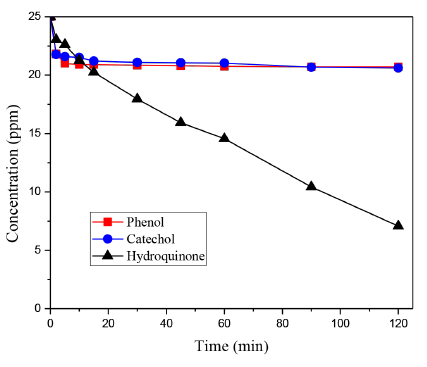 Photolysis experiments for each phenolic compound without catalyst and under UV-Visible light were carried out as the blank test; the results obtained are represented in Figure 5. As it can be seen in this figure, the photolysis phenomenon is negligible in the case of Phenol and Catechol; however, Hydroquinone is very susceptible to be degraded under illumination, thus, the Hydroquinone concentration highly decreases by photolysis from 25 to 7 ppm. Taking into account these results, it is expected that this compound presents the highest degradation rate during the photocatalytic reactions.