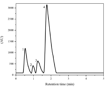Figure 6 shows the HPLC signals identified after five minutes of Phenol photodegradation by using ZnO as photocatalyst. In this figure, it is possible to clearly identify 4 signals, thus indicating that phenol can be transformed into three new compounds during reaction, these compounds were identified as Catechol (retention time 0.5 min), Hydroquinone (retention time 0.98 min), at the retention time of 1.26 minutes was detected an unidentified intermediate compound, this signal is probably due to the formation of Resorcinol or a short chain organic acid, as it was indicated by different authors [20-23]; finally, the phenol signal is located at 1.77 minutes.