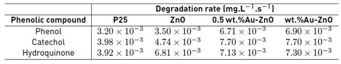 On the other hand, and taking into account that TiO2 has been considered as the typical reference semiconductor in photocatalysis, in this section, a commercial sample of Evonik P25 was tested in the degradation of the phenolic compounds, and it was observed that the efficiency of TiO2 in the phenolic compounds photodegradation is lower than the obtained with ZnO and Au-ZnO photocatalyst, these degradation rate results have been included in Table 1.