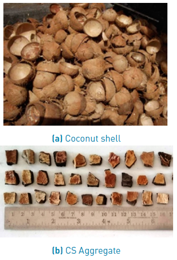 Hence, the effective utilisation of agro-wastes, as replacement for traditional aggregates, contributes to the conservation of non-renewable resources, reduces energy consumption and lowers the costs of building materials. Researchers have already used several waste materials in concrete, including recycled concrete, silica fume, ground-granulated blast-furnace slag, fly ash, waste tyre rubber, post-consumer glass and waste plastics [5,6]. Similarly, coconut shell (CS), palm kernel shell, oil palm shell (OPS), rice husk, corn cob, pistachio shell, spent mushroom substrate and tobacco wastes are waste materials used to produce lightweight aggregate concrete (LWAC). Hence, environmental protection can be achieved through the proper disposal of such solid agro-wastes [1].