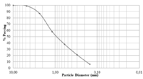 River sand passing through 4.75 mm sieve was used as fine aggregates. The silt content was removed from the sand by washing the sand before using it in concrete. A river sand content of 749.7 kg/m3 was used in all the mixes. The fineness modulus and specific gravity of river sand were 2.25 and 2.58, respectively. The particle size distribution of fine aggregates is presented in Figure 3.