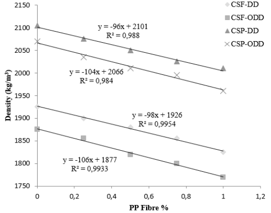Concrete with a density of 2000 kg/m3 and below is called structural lightweight concrete [29]. The density of concrete is reduced significantly by adding polypropylene fibres to structural lightweight concrete [17, 19]. In the current study, demoulded density (DD) and oven-dry density (ODD) were obtained for the CSF and CSP series, as shown in Table 6. The ODD of all the mixes in the CFS series satisfied the requirement of structural lightweight concrete as ODD ranged from 1875 kg/m3 to 1770 kg/m3. The maximum density reduction was achieved in the CSF100 mix and was 6% lesser than the corresponding mix without fibres. In the CSP series, the requirement of lightweight concrete was satisfied only when fibre addition exceeded 0.75%. The reduction in density due to the increasing addition of polypropylene fibres to concrete is attributed to the low specific gravity of fibres. Density reduction lowers the dead weight of concrete, and thus, the cost of the foundation of a structure becomes economical by providing polypropylene fibre-reinforced CS concrete. A very good correlation was obtained between each density type (DD and ODD) and the amount of fibres in CSF and CSP concrete, as shown in Figure 4.