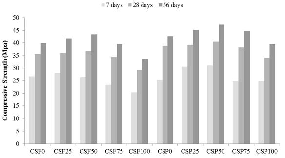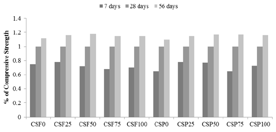 In the current experiment, adding polypropylene fibres generally increases the compressive strength of CS concrete. An increase in compressive loading will initiate the development of a crack. Once the crack reaches the fibres, the bond on the fibre-mortar interface will start to loosen due to stress development in the normal direction of the expected path of the developing crack. This phenomenon is known as the bridging effect of fibres in concrete [31]. The compressive strength at 7, 28 days and 56 days of all the mixes are presented in Figure 5. In general, the addition of polypropylene fibre increased the compressive strength up to 0.5% and decreased afterwards in both the mixes. The compressive strength of CS concrete increases at 28 days and 56 days with the addition of 0.25% and 0.5% polypropylene fibres to the CSF and CSP series. The compressive strength at 28 days was increased by 1.1% and 3.4% for 0.25% and 0.5% fibre addition, respectively, in the CSF series. A similar trend was observed in the CSP series, and the increasing percentage of compressive strength was 1% and 4.1% for 0.25% and 0.5% polypropylene fibre addition, respectively. This result may be attributed to the high tensile strength of polypropylene fibres (600 MPa). By contrast, the addition of 0.75% and 1.0% polypropylene fibres reduced compressive strength in the CSF and CSP series, and the values were significant in the CSF100 and CSP100 mixes. The compressive strengths development at 7 and 56 days over 28 days for CSF and CSP concretes with various fractions of fibres are shown in Figure 6. A significant increase in compressive strength at 56 days was observed in all the mixes, which might be due to the pozzolanic reaction of fly ash even after 28 days. The difference between the compressive strengths at 28 days and 56 days of all the mixes with fibres is higher than that of the control mixes CSF0 and CSP0. These findings concur with the literature [19], who worked on OPS concrete.