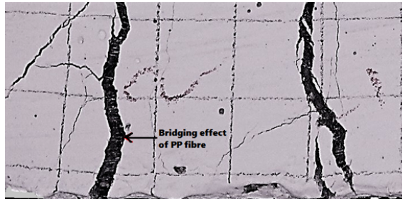 The addition of fibres to concrete considerably improves the tensile and flexural characteristics of concrete, such as tensile strength, flexural strength, impact strength, ductility and flexural toughness, during the hardened stage [33]. Previous studies have shown that the inclusion of fibres significantly improves the splitting tensile strength of LWAC [34, 35]. In the current study, the addition of polypropylene fibres to CS lightweight concrete exerts a beneficial effect on flexural and splitting tensile strengths. The split tensile strength and flexural strength of all the mixes are provided in Table 7. The addition of polypropylene fibres (0.25%-1.0%) improved split tensile strength by up to 11%-22% and 11%-26% in the CSF and CSP series, respectively, compared with the control mix. The flexural strength results show that the 28-day flexural strength resulted in a positive impact on all the mixes with fibres compared with the control mix. The 28-day flexural strength corresponds to a range of 6%-29 % and 4%-22% of the 28-day compressive strength of the CSF and CSP mixes, respectively. The increasing rate of flexural strength is 25%, 29%, 23% and 6% for the CSF25, CSF50, CSF74 and CSF100 mixes and 16%, 22%, 15% and 4% for the CSP25, CSP50, CSP75 and CSP100 mixes, respectively. The effect of polypropylene fibres on the flexural strength of the CSF mix was more positive than that on the CSP mix. Maximum flexural strength was reported in CSF75 and CSP50 mixes. Although polypropylene fibres have low tensile strength, they can strengthen cementitious materials that are brittle in nature by bearing part of the applied loads and exhibiting the bridging effect [17]. The bridging effect of CSP50 is shown in Figure 8.