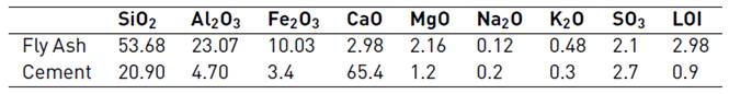 Ordinary Portland cement (OPC) with grade 53 and that conformed to IS 12269 was used in this study [22]. The specific gravity and Blaine’s specific surface area of the cement were 3.15 and 3510 cm2/g, respectively. Class F fly ash with specific surface area 7290 cm2/g and density 2130 kg/m3 was replaced by weight of cement in all the mixes at 10% of the cement weight. Cement and fly ash contents of 459 kg/m3 and 51 kg/m3, respectively, were used for the mixes. The chemical compositions of OPC and fly ash are provided in Table 1.