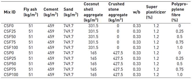 Fibre reinforced concrete containing waste coconut shell aggregate, fly ash and polypropylene fibre