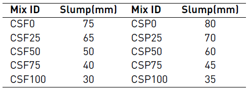 Two mixes were selected in this investigation. The first mix was prepared using lightweight CS aggregates as coarse aggregates. In the second mix, 50% of the CS aggregates were replaced with conventional crushed stone aggregates. The former was designated as CSF, whereas the latter was denoted as CSP. A CS aggregate content of 331.5 kg/m3 was used for all the CSF mixes, and a CS aggregate content of 165 kg/m3 and a crushed stone aggregate content of 427.5 kg/m3 were used for all the CSP mixes. The mix proportions of all the mixes are listed in Table 4. Polypropylene fibres with volume fractions of 0%, 0.25%, 0.5%, 0.75% and 1.0% were used in the mixes, and mixes without fibres were also prepared for comparison. The water/cement ratio and superplasticiser content were kept constant for all the mixes.