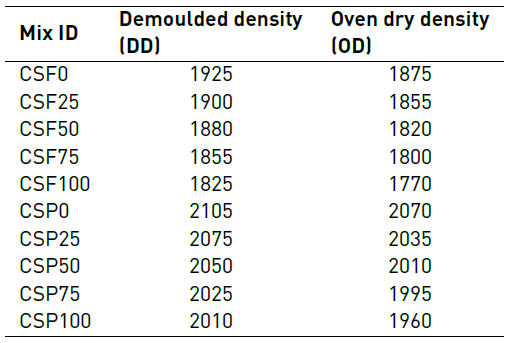 A constant percentage of superplasticiser was added throughout the study. The fresh polypropylene fibre-reinforced concrete had lower slump than the control. As shown in Table 5, increasing polypropylene fibre content in the mix decreases slump. The inclusion of fibres at volume fractions of 0.25%, 0.5%, 0.75% and 1.0% reduced slump by 13%, 33%, 46% and 60%, respectively, in the CSF series. Similarly, reduction in slump of 12%, 25%, 44% and 56% was observed for 0.25%, 0.5%, 0.75% and 1.0% fibre addition in CSP series. When CS is used under surface dry condition (i.e. SSD), it will not absorb water further whilst mixing, and thus, the workability of the CSF mix will be very similar to that of the CSP mix. The addition of fibres to fresh concrete improves interfacial fibre-matrix bond [17]. Consequently, low slump is observed at high fibre percentages. Authors in literature [27] reported that a 50-70 mm slump of LWC is equivalent to a 100-125 mm slump of conventional concrete. Authors in literature [28] achieved good workability by determining the optimal quantity of fine aggregates and incorporating a superplasticiser.