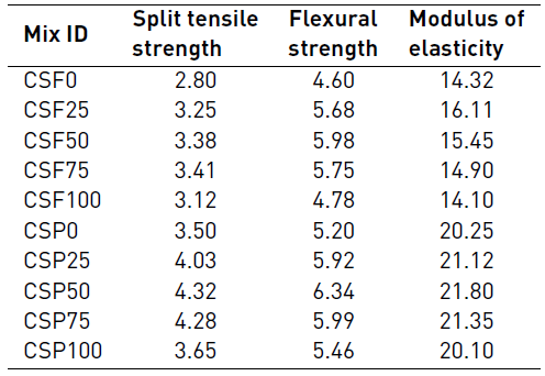 In the current study, an equation is proposed to correlate the split tensile strength and compressive strength of fibre-reinforced CSF and CSP mixes in Equations (4) and (5) with 8% and 12% errors, respectively.