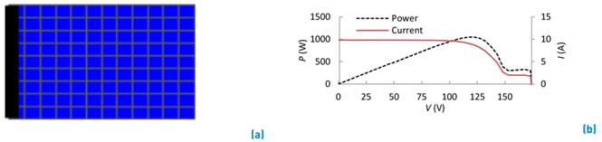 First one affecting 4 modules. In each module a line of 12 cells, belonging the same circuit, is shaded at 50% of its surface [Figure 9a). In Figure 9b, power graph exhibits two MPP at 1035.8 W and 1092 W.