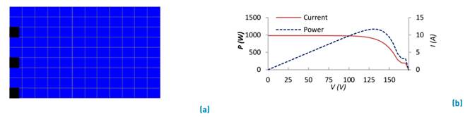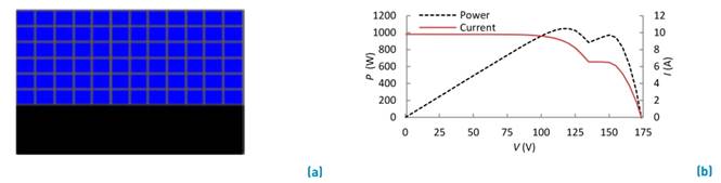 Last test affects only to one fully covered cell of one single module [Figure 13a). In the graph of the simulation [Figure 13b) the difference between the two MPP that characterize a partially shaded module is almost not appreciated with a maximum MPP is 1176 W and a second one with 976 W.