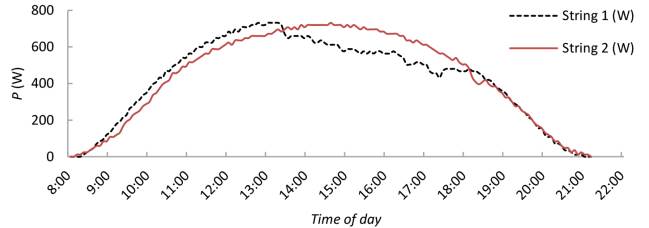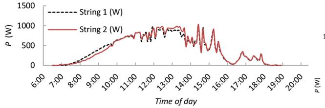 There are natural shadows affecting both Strings in late afternoon and first evening hours. Figures along this section present the power in each time of the day, in contrast to the previous section in which simulated IV curves were showed. This is because field experiments presented in this section are performed with the objective of calculating the difference of production using optimizers, in a specific period of time, and thus it is dependent on the external conditions during that timeframe. On the other hand, IV curves in the previous section were presented to show how the different defined shadow configurations affect the production. However, two experimental IV curves have been included at the end of the section, which are compared with the simulated ones.