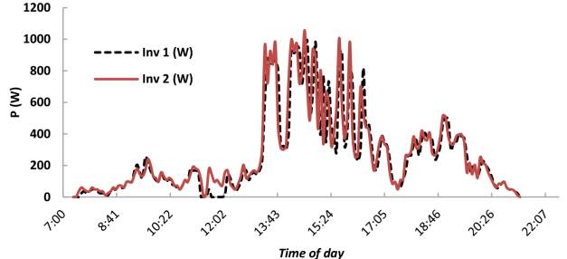 Five days of benchmark data with similar production graphics in sunny days [Figure 14] and disparate production charts on cloudy days [Figure 15], left two recognizable patterns common to all days: string 2 starts sooner than string 1 and string 1 produces more than string 2 in the first hours of the morning. In cloudy days, string 1 has more difficulty reaching some of the production peaks after the cloud leaves [Figure 15].