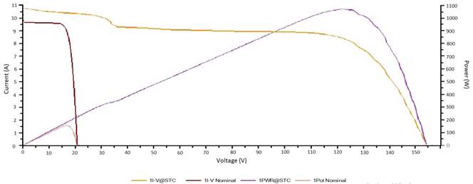 Additionally, to the analysis of the production introduced, it has been performed the real IV curves of the strings for each shading configuration using the HT SOLAR IV-400 TRACER. Some of these results are presented in this section. Figure 24 shows the IV curve of Test 4 configuration which is really similar to Figure 6b: Both have one lower MPP (at low voltage and high current value) and then one higher MPP (at high voltage and low current value). The big difference between them relies on the first MPP, as simulation points it at 1035.8 W but the real measure sets it at 700W. This is mainly caused by the degradation of the module, which has been exposed during several years as detailed in the methodology.