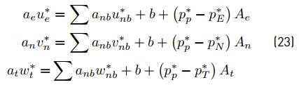 Equation (23) can be solved only when the pressure field is given or estimated. Unless the correct pressure field is employed, the resulting velocity field will not satisfy the relation. Therefore, an initial velocity field (u*, v*, w*) is calculated based on a guessed pressure distribution (p*) to start the iterations. Then, a new value of pressure (p) is updated from Equation (24).