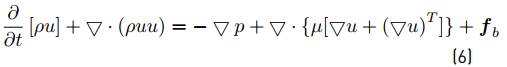 The incompressible fluid flows are governed by the Navier Stokes equations of mass conservation (Equation (5)] and momentum (Equation (6)].