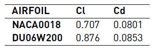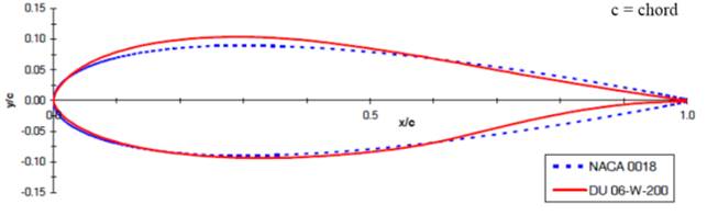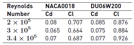 -Lift coefficients for the DU06W200 airfoil at Reynolds numbers between 2 x 105 and 3.4 x 104 are 23% greater than the NACA0018 ones.