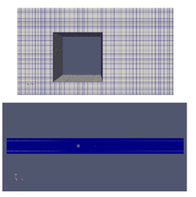 A Cartesian orthogonal mesh is used and refined at the boundaries of the obstacle, i.e. cube, as Figure 10 shows. Velocity components and turbulent fluctuations are averaged in time and in the cross-stream direction.