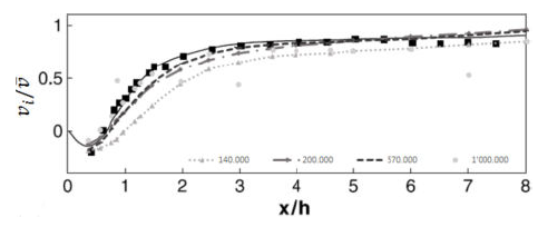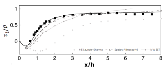 At Figure 11, the mean streamwise velocity along the centerline is shown for different simulations varying the mesh density. The results are compared with the literature [17] (black line). This comparison is performed to find the mesh independence, which is at 5 x 105 cells, giving an average difference around 12% and standard deviation of 0,283. Therefore, the “simpleFoam” algorithm is validated for the Spalart-Allmaras fv3 turbulence model.