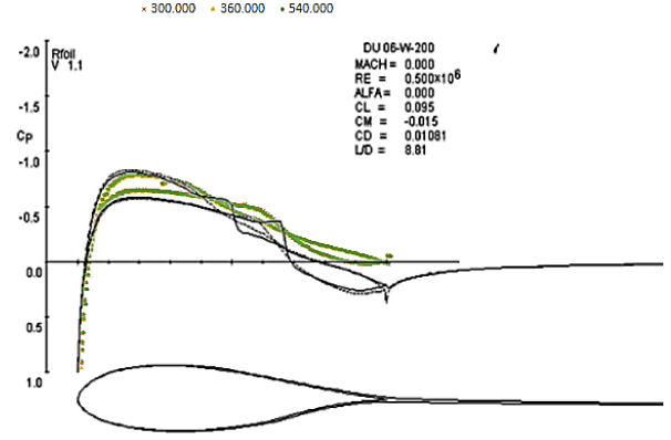 It can be concluded under the same Reynolds number, the lift coefficient of the DU06W200 airfoil overcomes in 23.3% the one from the NACA0018. As the Reynolds number increases, the lift coefficient increases too and the performance of the DU06W200 corresponds to the expectations of [3] design.