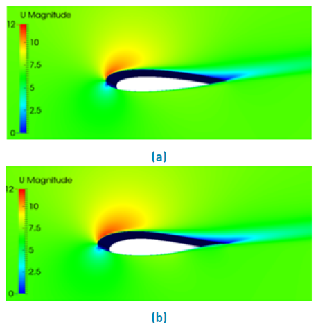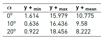 The numerical results are validated by comparing the lift and drag coefficients from the literature [7]. The airfoil is simulated under three different angles of attack: 0°, 10°, and 20°. The chord length (c) of the airfoil is 0.25 [m] and a Reynolds number of 3 x 105 Results are shown in Table 6, Table 7 and Table 8. The boundary conditions are the same mentioned at Table 3. The ‘nutUSpaldingWallFunction” provides a turbulent kinematic viscosity condition when using wall functions for rough walls, based on velocity, using Spalding's law to give a continuous nut profile to the wall (y+ = 0).