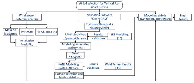 Figure 2 shows the research scheme applied in this study. The work is composed by two components: firstly, a wind density potential study of Chicamocha’s canyon, and secondly, a CFD modeling aimed to compare the airfoil’s performance under realistic conditions to suggest one for the wind turbine blades.