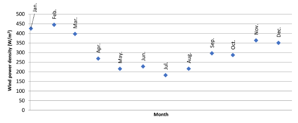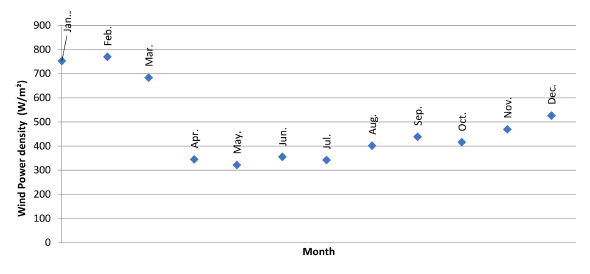 The annual average wind speed range from 5 up to 7 [m/s], giving a maximum wind power density of 450 [W/m2 ]on February and a minimum of 180 [W/m2 ] on July [Figure 5].